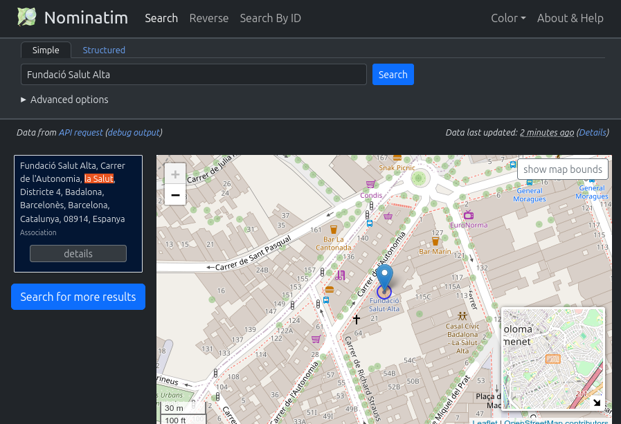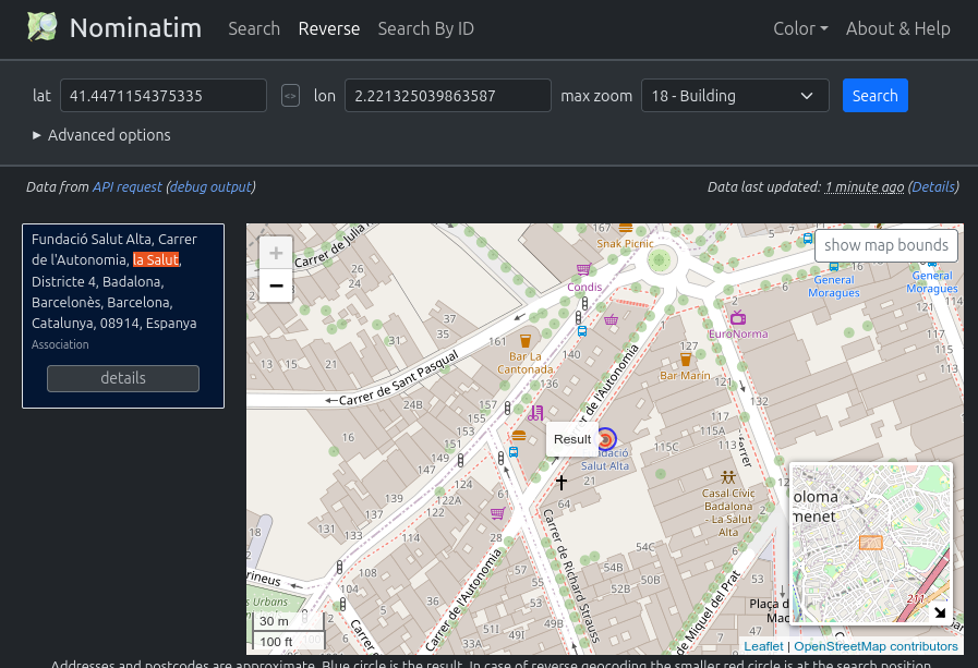 Es pot cercar el barri amb l'eina Nominatim d'OpenStreetMap fent clic sobre el mapa o bé cercant l'adreça (només carrer, número i població) i desplegant els detalls de l'adreça.